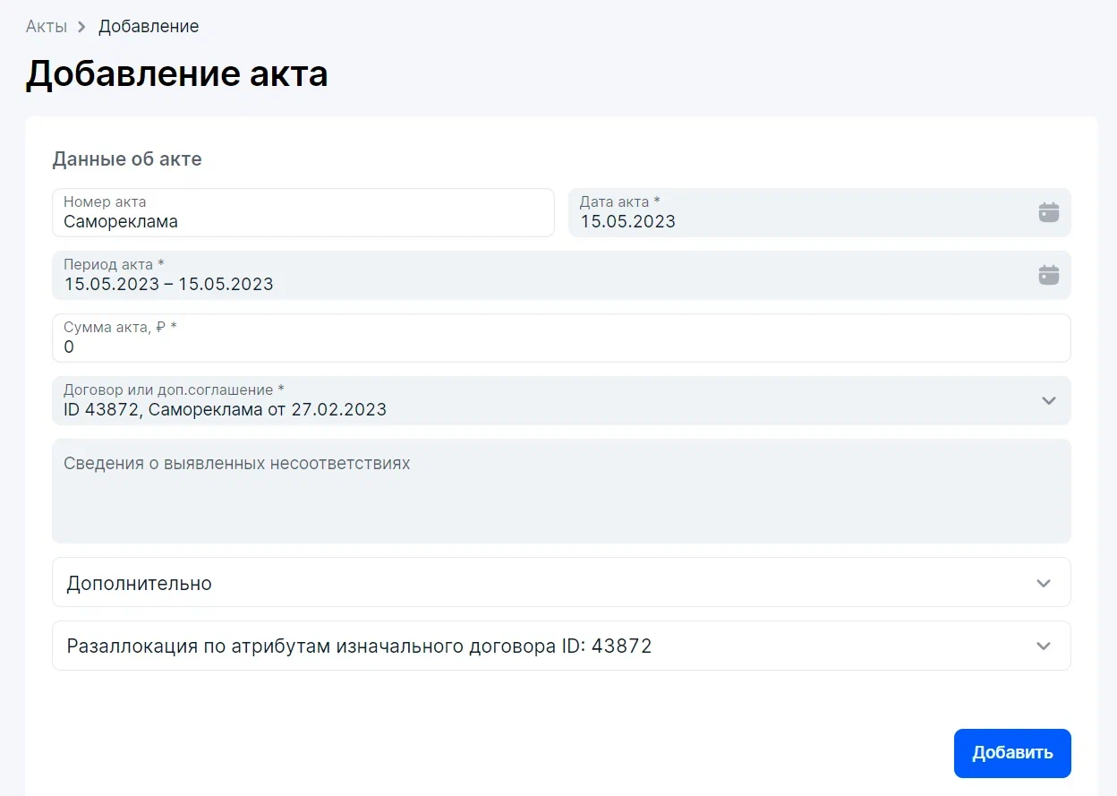 В разных ОРД есть возможность промаркировать саморекламу. Например, в Ozon ОРД для этого нужно при создании креатива включить чекбокс «Самореклама» и указать контрагента саморекламы.