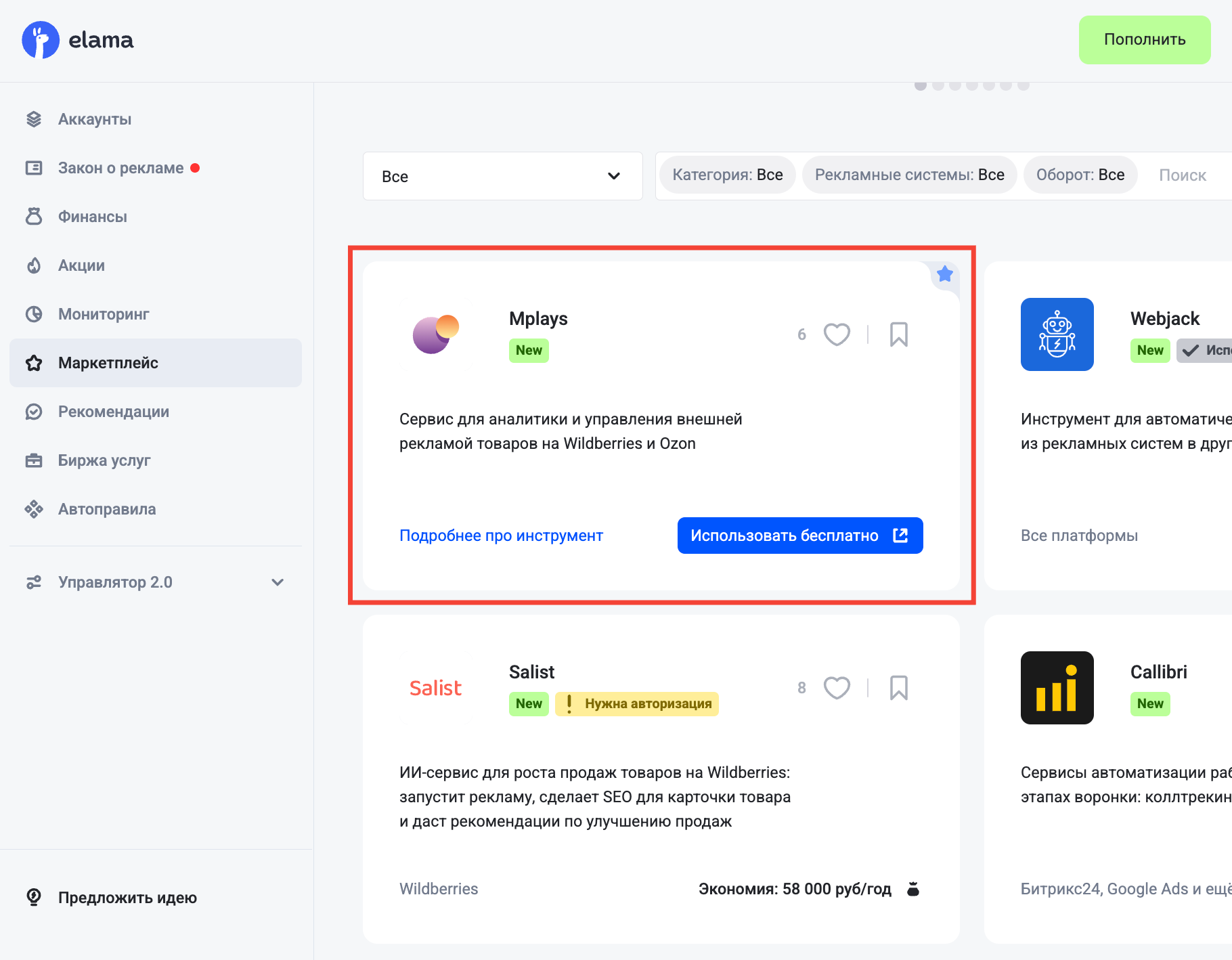 На нашем маркетплейсе становится всё больше полезных сервисов для селлеров. Представляем MPlays — инструмент аналитики и управления внешней рекламой для Wildberries и Ozon. Он поможет вам понимать, кто у вас покупает, оценивать эффективность любой внешней рекламы и действовать так, чтобы получать от нее больше. Клиенты eLama могут пользоваться MPlays бесплатно.