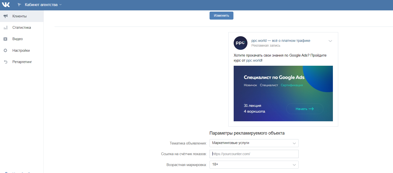 Шаг 1. Настройка рекламного кабинета ВКонтакте