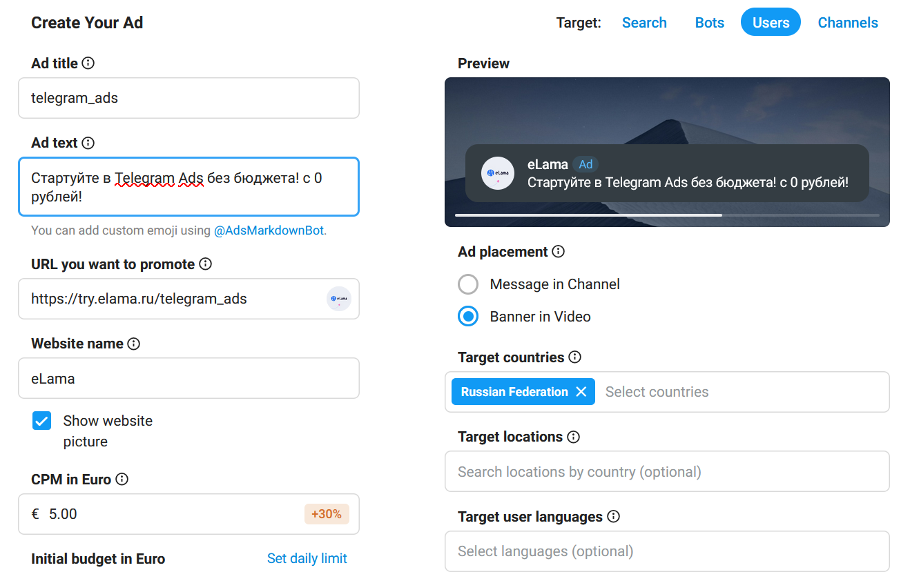 Новый тип креатива доступен только при таргетинге на пользователей Telegram (можно нацеливаться по географии, языку, интересам, каналам, в которых состоят пользователи).