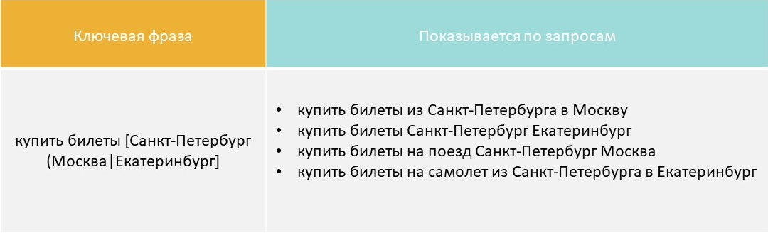 Объявления с такими ключевыми фразами и операторами будут показываться по одному запросу из нескольких фраз.