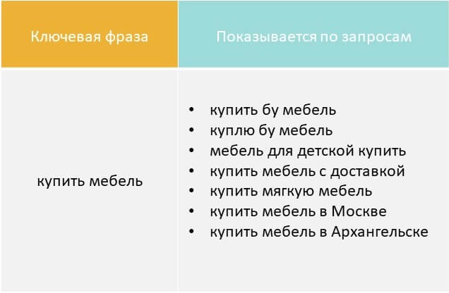 Но кроме пословного есть еще семантическое соответствие, когда система считает, что запрос пользователя похож на те, на которые рекламодатель таргетируется с помощью ключевых фраз. То есть в поисковом запросе могут быть слова, которые рекламодатель не указал в ключевой фразе, но показ все равно происходит.