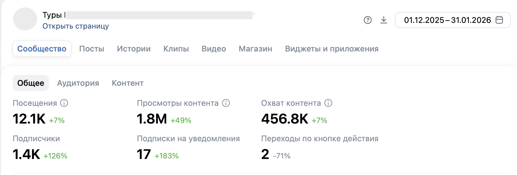 *На скриншоте период с декабря 2025 года по январь 2026. Ровно два месяца после полного перехода в VK Рекламу. Прирост подписчиков и активность внутри сообщества растут, об этом говорят показатели прироста (проценты рядом с основными метриками).