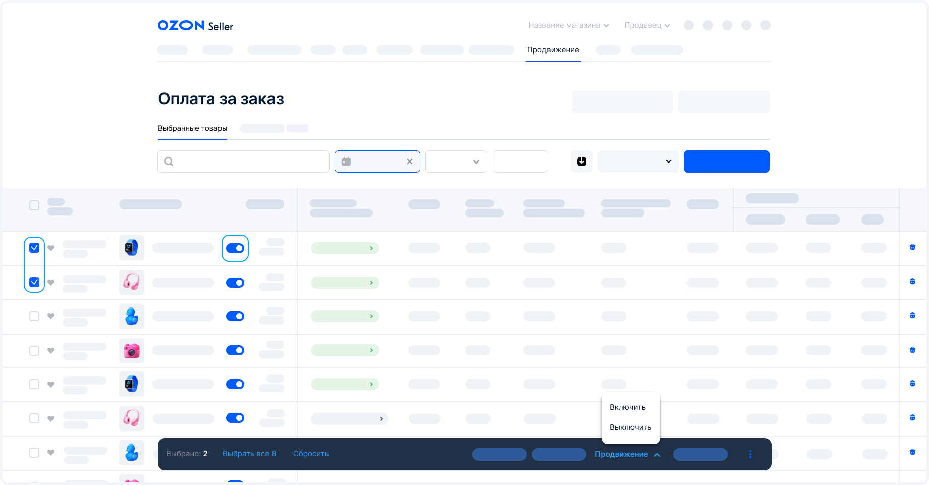 1. Откройте раздел «Продвижение» → «Оплата за заказ» → «Выбранные товары».
