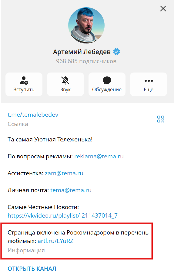 А вот как указал ссылку на подтверждение регистрации своего канала в Telegram и Артемий Лебедев: