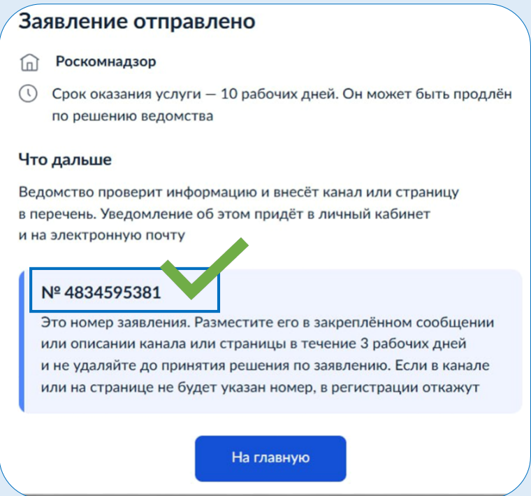Отправьте заявление и сохраните его номер. Он находится в личном кабинете Госуслуг, в разделе «Заявления». Номер заявления на регистрацию — это и есть тот самый номер, который нужно поставить в описание страницы или канала.