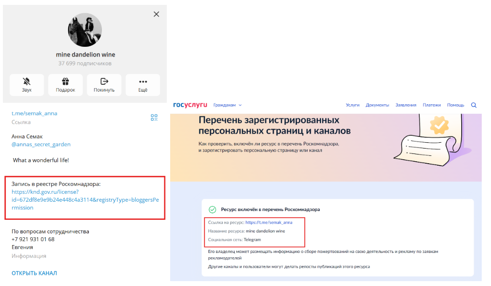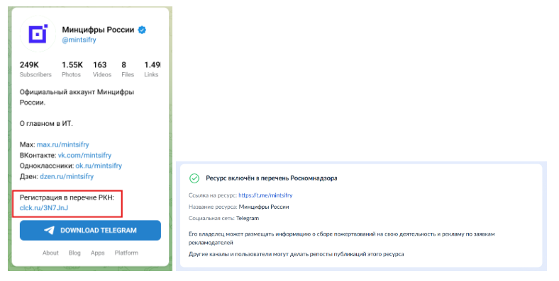 После того как вы получите подтверждение регистрации на email и в личном кабинете Госуслуг, разместите в описании блога или закрепленном сообщении ссылку на страницу из Перечня зарегистрированных ресурсов Роскомнадзора, где указаны данные о регистрации вашего блога.