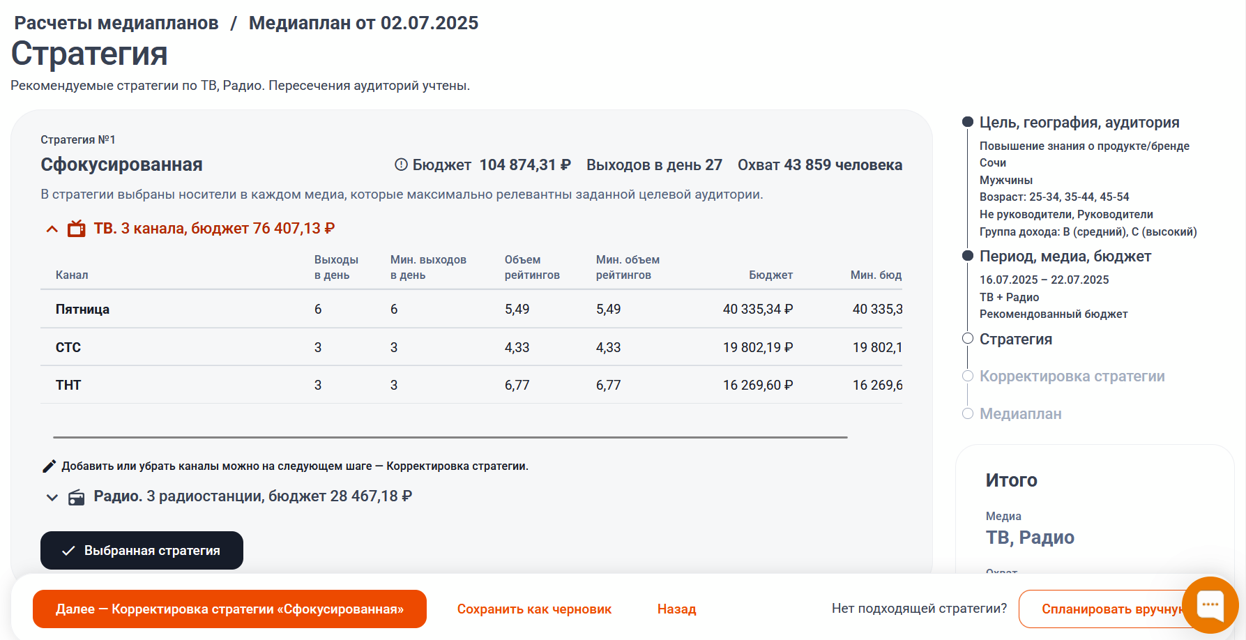 Платформа анализирует ваши цели, аудиторию и регион, чтобы предложить наиболее эффективный медиамикс, спрогнозировать охваты и оптимальный бюджет. Все рекомендации — на основе рыночной аналитики. Вы получаете медиаплан за несколько минут вместо того, чтобы неделями согласовывать договоры, брифы и планы с каждой телекомпанией или радиостанцией.