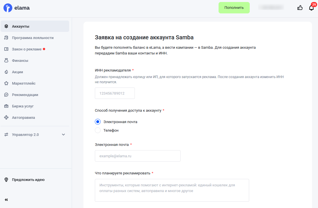 Оставьте заявку в кабинете eLama. В форме укажите ИНН рекламодателя, почту или телефон для доступа к аккаунту и продукт рекламирования. Мы создадим аккаунт в SAMBA — и вы сможете самостоятельно запускать рекламу.