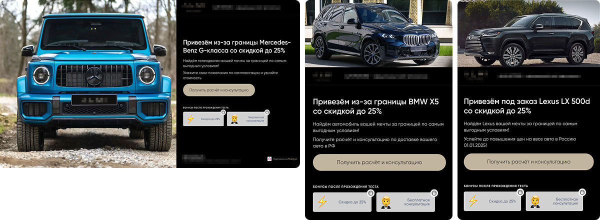 Собрали отдельные квизы под топовые в продажах автомобили. Для создания использовали «Марквиз», доступный бесплатно на маркетплейсе eLama.