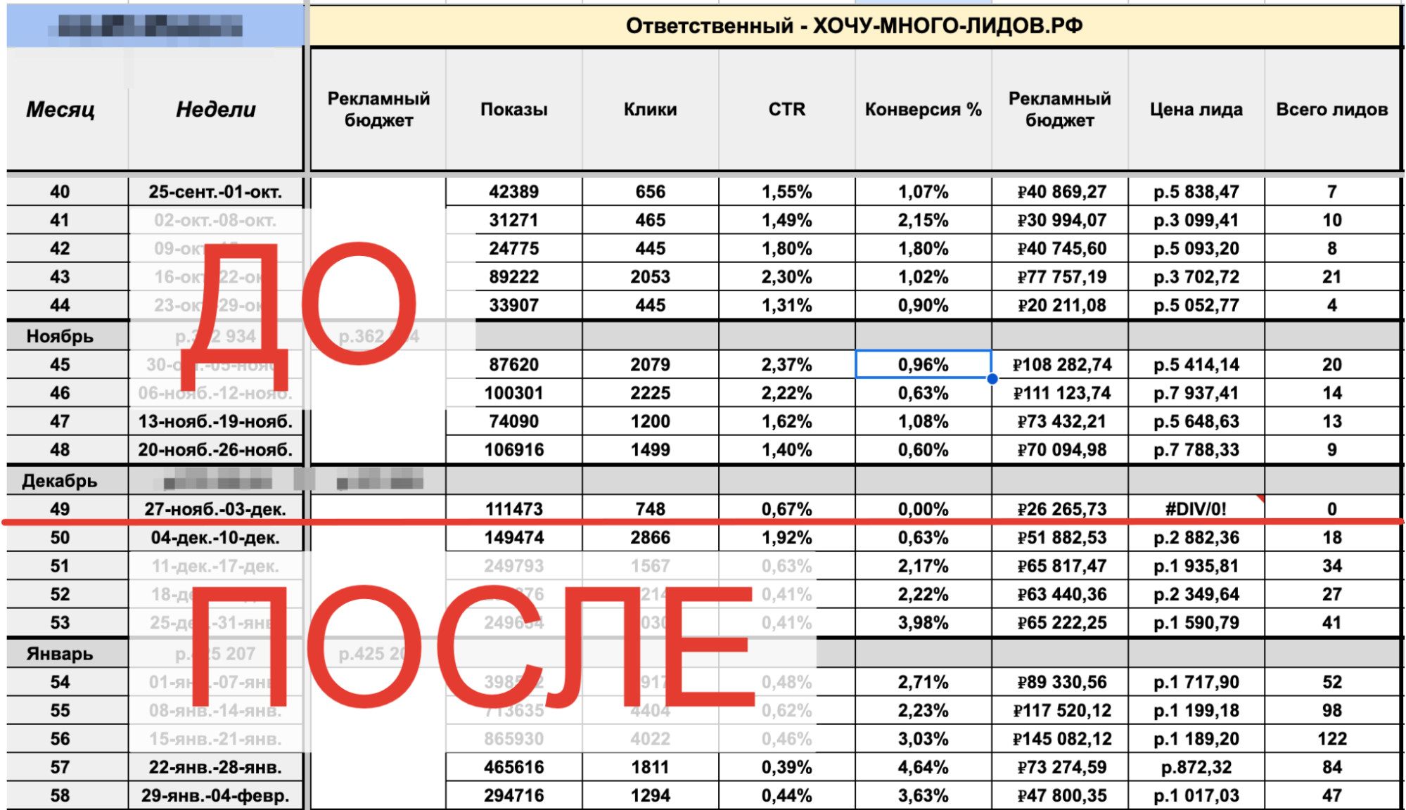 Уже через неделю после старта (на неделе с 11 по 17 декабря) конверсия выросла в 2 раза, а стоимость заявки снизилась с 7778 руб. (в ноябре) до 1935 руб. (третья неделя декабря). А к концу декабря показатели улучшились еще на 18% Результаты: +1339% в заявках за год