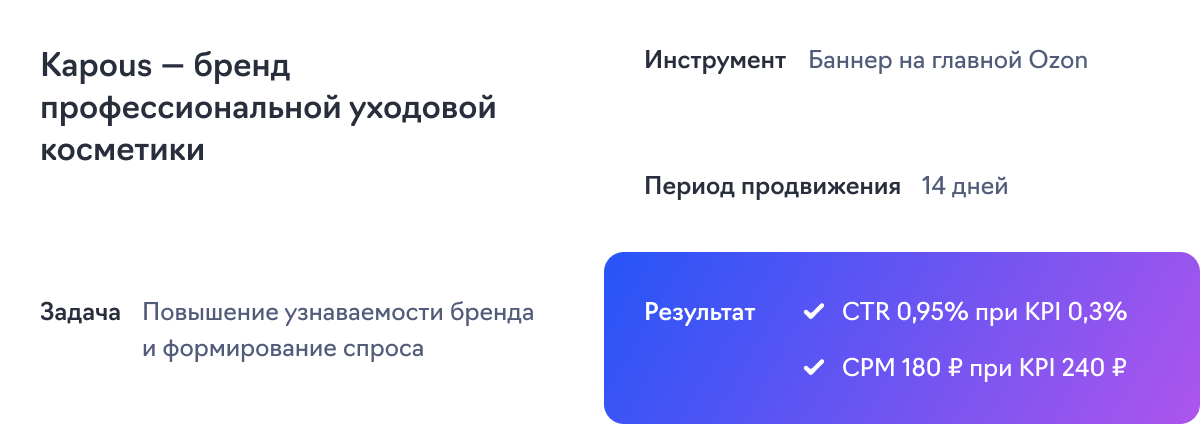 По результатам продвижения Ozon оказался в топ-3 каналов-лидеров по стоимости конверсии среди всех источников привлечения покупок.