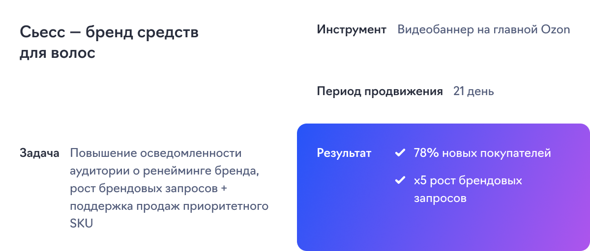 Но главное — увеличил интерес к бренду: количество брендовых запросов выросло в 5 раз. Также размещение привлекло внимание новой аудитории, которая раньше не покупала продукцию бренда, — медийная реклама на площадке дала 78% новых покупателей.