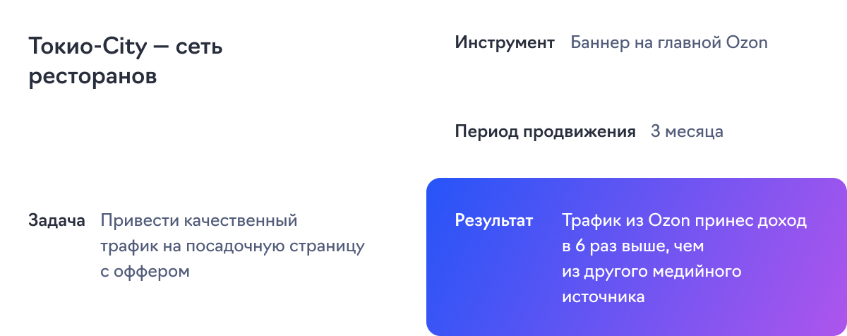 Лучшая стоимость конверсии и рост post-click дохода: результаты размещения на Ozon ресторанного бизнеса