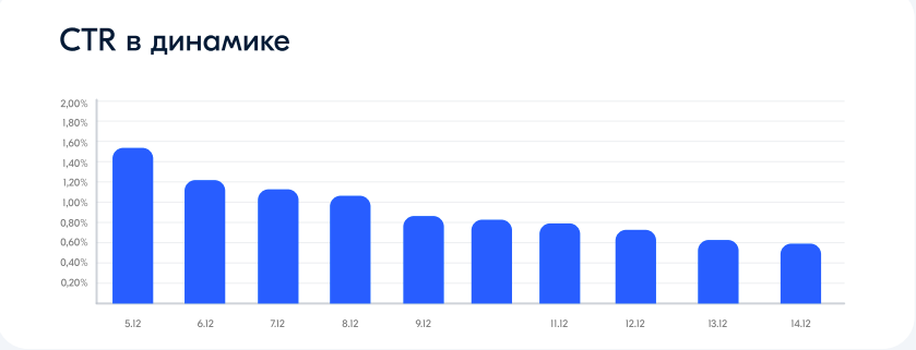 Определили KPI: CPM — до 240 руб., CTR — от 0,3%. Сразу после запуска кампании увидели, что CTR гораздо выше прогнозных значений, но периодически он немного снижался, что нормально для медийной рекламы. Чтобы сохранять высокий CTR, важно запускать несколько баннеров в ротацию и менять креативы при продолжительных размещениях.