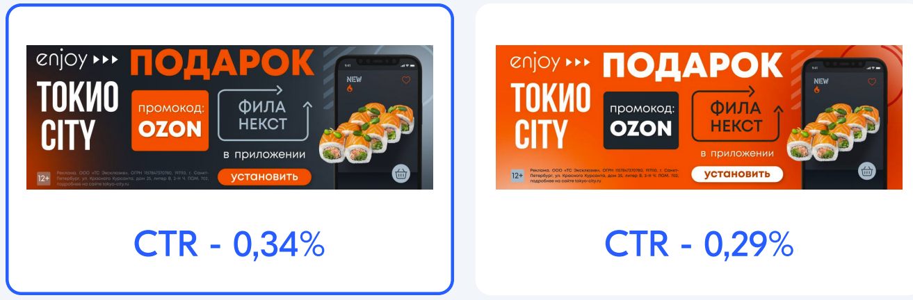 Креативы, использованные в рекламных кампаниях, показали высокие результаты — CTR достигал 0,44%.