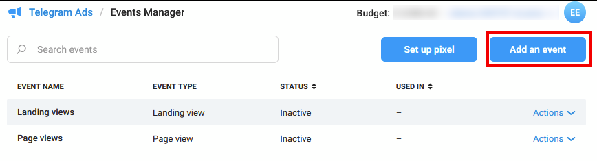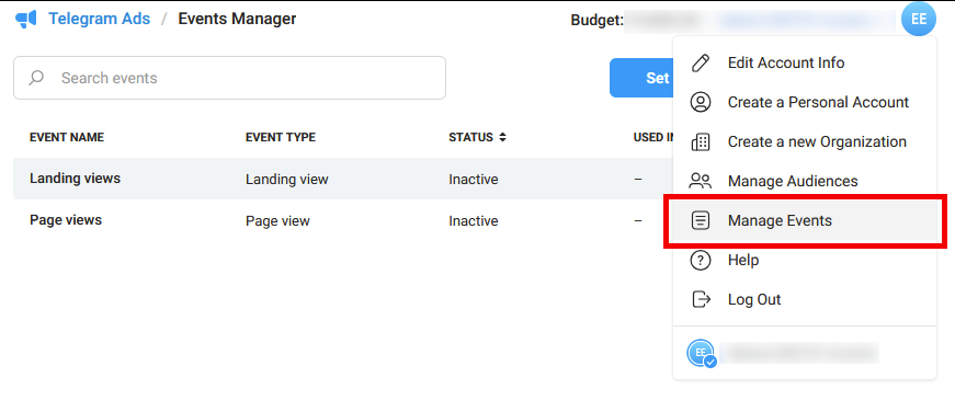 В аккаунте Telegram Ads переходим в раздел Manage Events (Управление событиями).
