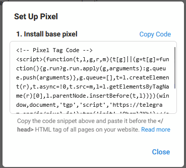 Здесь необходимо нажать кнопку Create a pixel (Создать пиксель) — вы увидите окно с кодом, который нужно скопировать для установки пикселя.