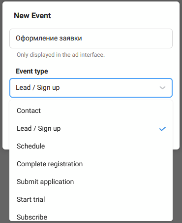 В окне введите название события и выберите тип события, которое вы хотите отслеживать. Доступно 19 типов событий, однако его выбор, строго говоря, ни на что не влияет, кроме как на отображение названия события в списке — структура кода при создании событий разных типов одинаковая.